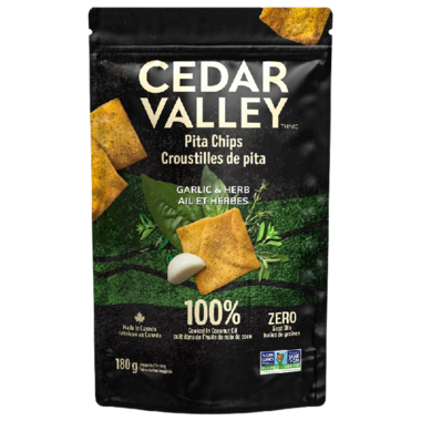 Cedar Valley Pita Chips Garlic and Herb are Made in Canada with zero seed oils, 100% cooked in coconut oil.
