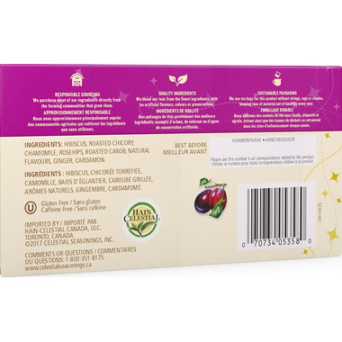 Ingredients: Hibiscus, roasted chicory, chamomile, rosehips, roasted carob, natural flavors, ginger and cardamon.