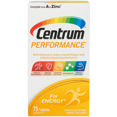 Centrum Performance is a premium multivitamin formulated with higher levels of essential nutrients, including the B vitamins and ginseng, to help energize your body everyday. The addition of ginseng can also help improve physical and mental performance.