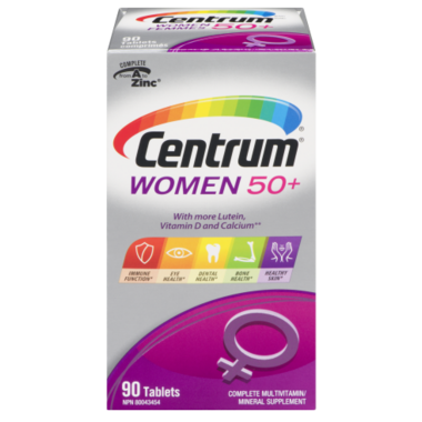 Specially formulated for women over 50 years old, Centrum Women 50+ multivitamins contain lutein, vitamin D, and calcium to address the nutritional needs of women over 50.
