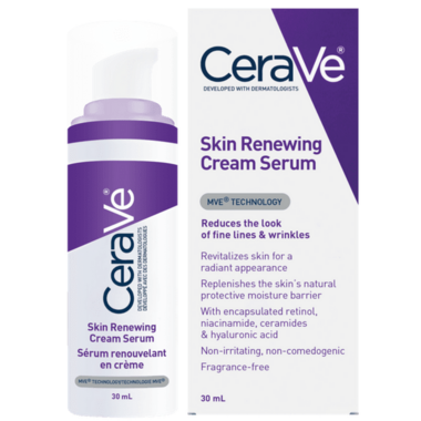 CeraVe Skin Renewing Cream Serum is a gentle yet effective daily Retinol cream Serum that provides a variety of anti-aging benefits. Enhanced with three essential Ceramides, Hyaluronic Acid and Niacinamide to help restore the skin barrier, retain hydration and help sooth the skin. Plus, it includes patented time-release MVE Delivery Technology for all-day hydration.