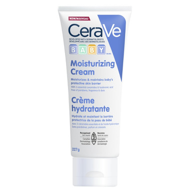 Developed with pediatric dermatologists, CeraVe Baby Moisturizing Cream provides comforting all-day moisture, with three essential ceramides, hyaluronic acid and dimethicone to moisturize, retain skin's natural moisture, and maintain baby's protective skin barrier as it develops. Formulated to deliver up to 24 hours of moisture, our fragrance-free, paraben-free and dye-free baby cream is rich in texture and provides your baby’s skin with gentle all-day hydration. This moisturizing cream features a cushiony formula that relieves dry skin.
