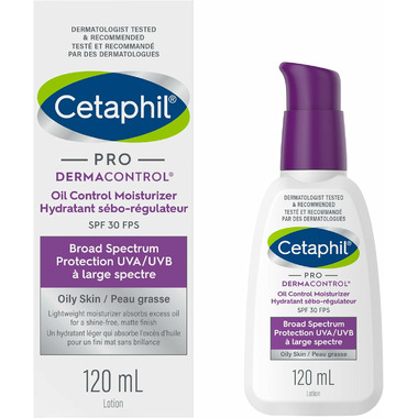 Cetaphil DERMACONTROL Oil Control Moisturizer SPF 30 contains a zinc Complex for oily, combination or blemish-prone skin. Our oil absorbing ZINC COMPLEX includes Zinc Gluconate to remove excess oil from the skin, without disrupting the skin’s moisture barrier. Ceramides replenish the skin’s moisture barrier and provides long-lasting hydration. This lightweight 3-in-1 moisturizer helps improve the skins appearance by providing hydration, shine control and SPF 30 broad spectrum UVA/UVB protection.