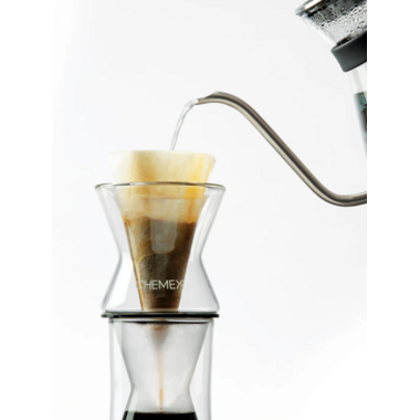 The FUNNEX offers the same brewing experience that you know and love from your favourite 3 Cup CHEMEX Chemex (CM-1, CM-1C, CM-1GH), but in a smaller package. It's made from non-porous Borosilicate glass that doesn't absorb nasty odours or chemical residue. What separates the FUNNEX from the other CHEMEX coffee makers is that it allows you to brew into whatever vessel or coffee server that you choose! This versatility allows you to brew directly into your travel mug, or you can use multiple FUNNEX brewers on a pour-over stand in your cafe for a very fun brewing experience! The double-walled glass design keeps heat loss to a minimum while also retaining the Classic CHEMEX look and feel.