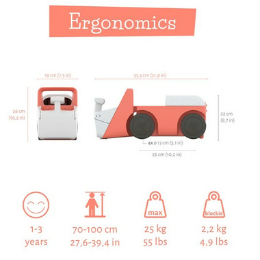 When cleaning becomes fun! Chillafish Blockie is a lightweight and easy to handle 4-wheel first ride-on that carries all your toys designed for developing a child's gross motor skills (riding, digger-style action) and fine motor skills (playing with blocks, shape sorting).