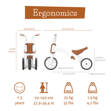 - The seat grows with your child (8.7 inch / 22 cm in 3-wheel mode to 9.8 inch / 25 cm in 2-wheel mode) to better support the new skills of your child.