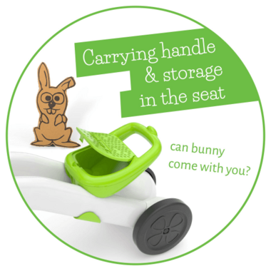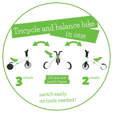 - Seat grows with your child (22cm in 3-wheel mode, 25cm in 2-wheel mode)