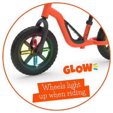 Chillafish Charlie Glow is a hyper lightweight 10" balance trainer with integrated light-up wheels when riding for extra fun and visibility. The LED lights in the wheels don't need any batteries, they are simply powered by riding the Charlie Glow - the faster you go, the harder they glow! This balance bike has puncture-proof tires and a high-quality metal frame weighing only 5.5 lbs/ 2.5 kg. The perfect toy to train your toddler gross motor skills, balance and steering.