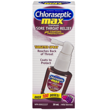 Chloraseptic Max Sore Throat Relief Spray plus coating protection provides fast acting, maximum strength relief of sore throat pain in a convenient spray. Numbs on contact; easy to control sprayer provides targeted relief.