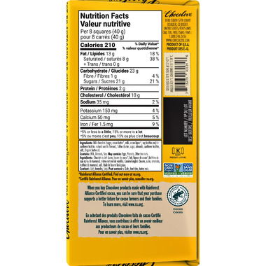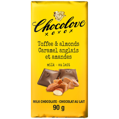 Smooth Belgian milk chocolate with chunks of almond toffee (33% cocoa).