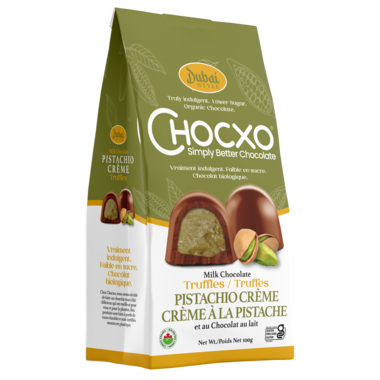 Chocxo Milk Chocolate Dubai Style Pistachio Creme Truffle. Truly Indulgent. Lower Sugar. Organic Chocolate.