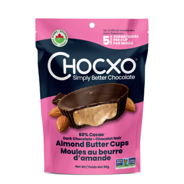 ChocXO Organic Dark Chocolate Almond Butter Cups is made with 56% cacao dark chocolate, pure and simple ingredients for people who really want to eat less sugar and live happier lives.