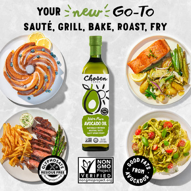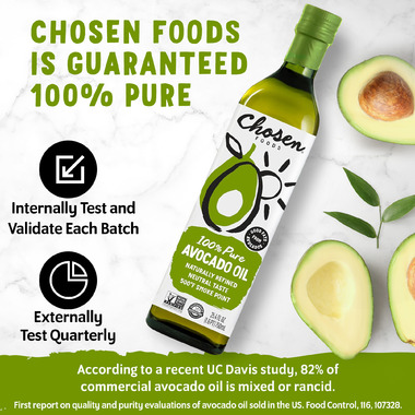 Chosen Foods' 100% Pure Avocado Oil is a kitchen essential. This all-purpose oil has a smooth, neutral taste that puts you food's flavor center stage like it ought to be. With its high smoke point and good fats from avocados, this versatile oil adds a little awesome to your everyday cooking routine.