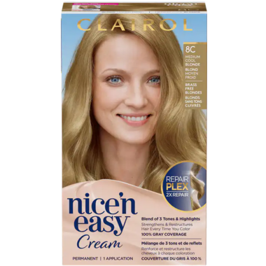 Clairol Nice n’ Easy permanent hair dye with a blend of 3 tones and highlights is a non-drip color cream designed for superior natural looking color.