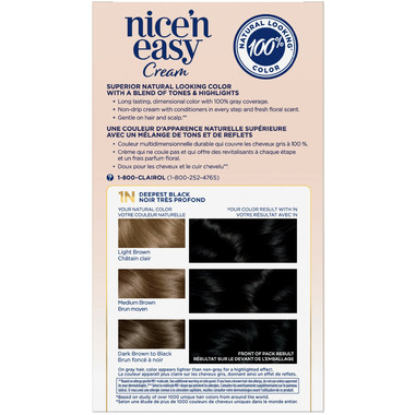 Clairol Nice n’ Easy permanent hair dye with a blend of 3 tones and highlights is a non-drip color cream designed for superior natural looking color.