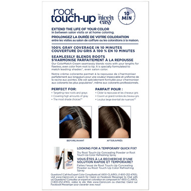 Root Touch-Up by Nice‘n Easy blends with leading shades, even salon shades in just 10 minutes.The ergonomically engineered brush delivers salon quality application. No roots, no greys, no trip to the salon.
