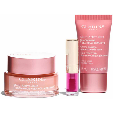 A skincare set that targets the first signs of aging for active women who want to protect their skin from the harmful effects of a hectic lifestyle. Two anti-aging creams, one for day and one for night, enriched with sea holly extract & niacinamide to visibly reduce the first signs of aging, moisturise and preserve the skin's youthfulness, and the Lip Comfort Oil to moisturize, nourish and comfort the lips. A large pouch holds all these products. For ages 30+.