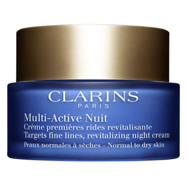 Nourishing anti-aging night moisturizer for normal to combination skin smoothes skin while you sleep. Encapsulated Teasel extract delivers targeted revitalizing and line-fighting action to where your skin needs it most. Organic California Poppy extract helps absorb the visible effects of late nights and interrupted sleep—so skin looks toned, rested and refreshed by morning. Formulated with Clarins' Anti-Pollution Complex to help fight the effects of pollution and free radicals.