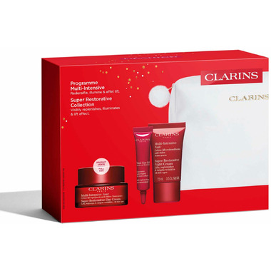 This set of replenishing skincare products is designed for skin affected by age-related hormonal changes: discover the replenishing Super Restorative Day Cream with harungana extract. The skin on the face feels plumper, its contours appear redefined and wrinkles are visibly smoothed. For a complete routine, Super Restorative Night will leave your skin radiant in the morning. For the eyes, the new Total Eye Lift helps smooth and plump the eye contour area. For a complete youth-boosting treatment, the iconic, ever-essential, new-generation Double Serum targets all the signs of ageing: wrinkles are visibly smoothed and the skin is firmer, plumper and more radiant. Even the skin texture is visibly improved and refined, with pores appearing minimized. A lovely pouch made from 87% recycled fibres holds all these products. Its recyclable* case is printed on paper from sustainably managed forests. *in accordance with local regulations.