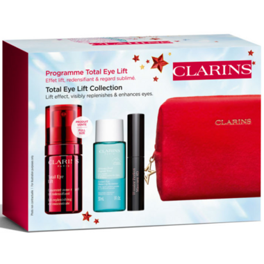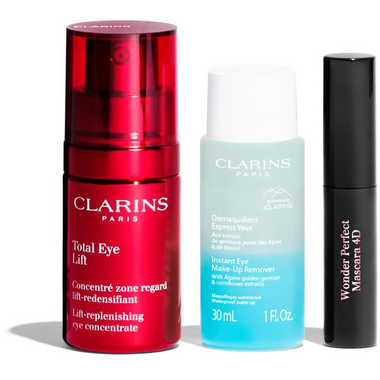 This set combines three expert formulas. The Total Eye Lift, delivering a remarkable lifting effect in just 60 seconds* with replenishing harungana extract and smoothing cassia wax to re-densify the skin. Enhance your lashes with Wonder Perfect Mascara. The Instant Eye Make-Up Remover will effectively remove all types of eye makeup, including waterproof formulas. A large pouch holds all these products. *