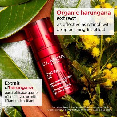 Clarins, the eye contour expert, introduces Total Eye Lift, an award-winning, naturally powerful, all-in-one, eye cream that targets wrinkles, crow's feet, dark circles, and puffiness for a visible eye lift in 60 seconds flat* designed for all women. This exceptional eye-lifting serum combats all factors, restoring radiance to skin at any age. Because you don't have time to waste, cassie wax, which visibly tightens and smoothes lines and wrinkles with immediate results and organic harungana extract that is as effective as retinol** and gentle on the skin, deeply replenishes and visibly firms the fragile skin around the eyes, were brought together to generate an instant smoothing-lift effect that challenges the clock. This redefining skincare formula was specifically created to enhance the entire eye area – from temple to temple – for women of all ages. Fine lines and wrinkles are visibly smoothed, the eye area appears replenished and rested, brighter, and refreshed. This sensorial, lightweight balm melts into the skin, prepping eyes for flawless makeup application and long-lasting wear. Its 94% naturally derived formula combines responsibly sourced precious plant materials. Gentle eye cream is suitable for all ages and all skin types—including contact lens wearers and those with sensitive eyes—and is housed in an airless glass bottle made of recycled glass.