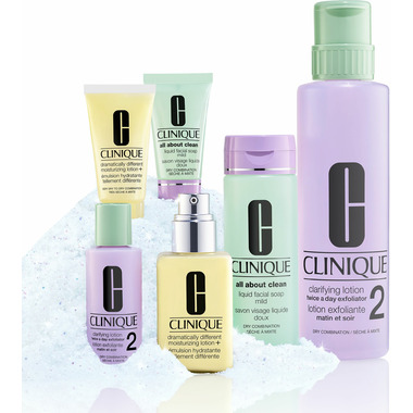 Clinique’s three signature steps for glowing skin—one set for home, one for travel. Customized for drier skin types. A $149 value.