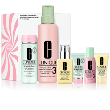 Our most-wanted holiday set. Clinique’s three signature steps for glowing skin—one set for home, one for travel. Customized for oilier skin types. A $96.50 value.