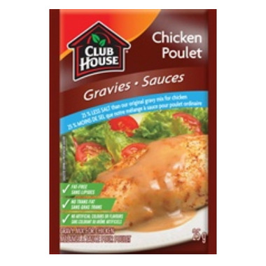Contains 25% less salt than regular Club House gravy mix for Chicken & has the same creamy gravy flavour seasoned with herbs & spices.