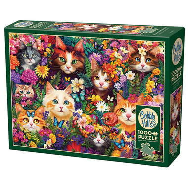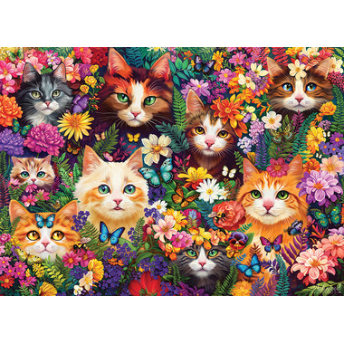 This enchanting 1000 piece puzzle, titled 'Blooming Whiskers', showcases a delightful array of cats nestled among vibrant and colorful flowers. Each cat's unique expression is surrounded by a burst of blossoms and butterflies, creating a whimsical and captivating scene. Designed by Brigid Ashwood.