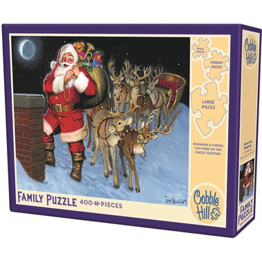 The town is silent on this moonlit night as Santa lands Up On The Rooftop with his reindeer. He's ready to deliver toys to sleeping boys and girls around the world. With small, medium, and large size pieces, this is a great Family Puzzle 400 piece to enjoy with kids of varying skill levels.