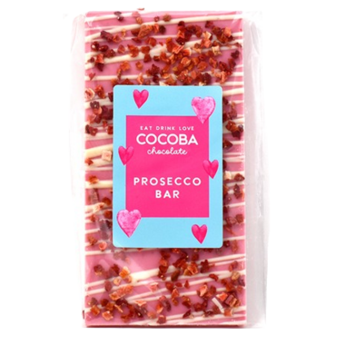 This delectable chocolate bar is handmade using Belgian white chocolate infused with prosecco flavouring, and decorated with white chocolate and freeze dried strawberry pieces. An irresistible treat for any occasion.