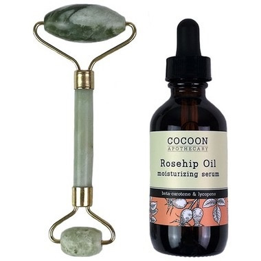 Jade Roller - A hand-held facial massage tool that reduces the appearance of puffiness and helps serums absorb into skin. Jade stone provides a smooth cold surface to glide roller back and forth over every area of the face and neck. It has two heads, a large one to cover the main areas of the face and a small one to use on the eye area.  Keep in fridge between use or put in freezer for a few minutes before use for extra cooling power.