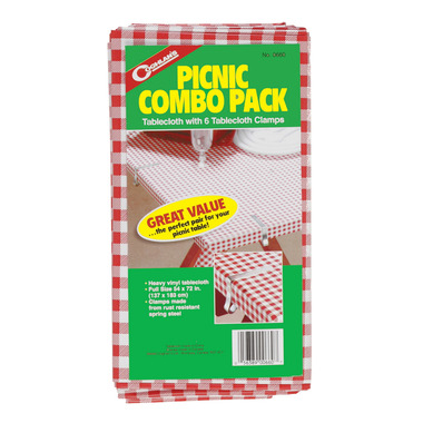 The Perfect Pair for your Picnic Table! Combo Pack featuring a Tablecloth and six Tablecloth Clamps. Size: 54” x 72” (137 x 183 cm)