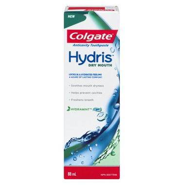 Colgate Hydris dry mouth toothpaste provides hydrating comfort for dry mouth sufferers. Hydris moisturizes and enhances a hydrated feeling in your mouth to relieve dryness, and cleans and freshens bad breath with a soothing mint flavor. Its sodium fluoride formula helps to prevent cavities, making it a safe and effective solution for everyday use. The formula, which includes moisture-rich plant based ingredients, locks in a hydrated feeling after you brush, for 4 hours of lasting comfort. Help relieve your dry mouth with Hydris Toothpaste from Colgate: dentist recommended brand.