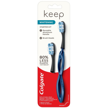 Colgate Keep Whitening Toothbrush Navy comes with two replaceable brush heads. The handle is made of aluminum to help reduce the amount of plastic into the solid waste streams.