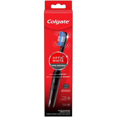 Introducing the Colgate Optic White Pro Series Battery Toothbrush. With a rubber polishing cup that removes more stains for a bright smile, this sonic battery power toothbrush has a powerful, yet gentle clean.