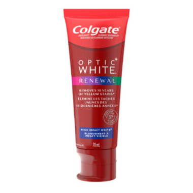 Colgate Optic White Renewal is our best whitening toothpaste ever. It contains 3% hydrogen peroxide, a professionally recommended whitening ingredient proven to deeply whiten beyond surface stains.