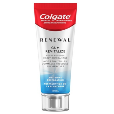 Colgate Renewal Whitening Restoration gum toothpaste helps reverse early gum damage. Its specialized formula reduces bleeding and inflammation for healthy and revitalized gums! Plus, this daily whitening fluoride toothpaste gently whitens teeth to remove surface stains and fights cavities.