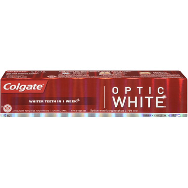 Colgate Optic White Toothpaste contains a high-impact whitening formula with hydrogen peroxide, designed to also whiten below the surface of the teeth. Get whiter teeth in one week, with daily use.