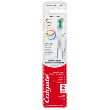 Colgate Total Active Prevention Foaming Clean Medium ToothbrushColgate Total Active Prevention Foaming Clean Medium Bristle Toothbrush is specially designed to tackle the root cause* cavities, plaque, gingivitis, bad breath, tartar buildup**, and stains***.Clean Hard to Reach AreasThe Colgate Total Active Prevention Foaming Clean Medium Manual Toothbrush features 2x more high-density Floss-Tip bristles (1) that reach deeper (2) along the gumline and between teeth to help clean hard to reach areas most prone to dental problems. Plus, this medium toothbrush uses high density center pads to polish away stains and disrupt plaque buildup.The Rapid Foaming DifferenceThe Colgate Total Active Prevention Foaming Clean 5000 bristle toothbrush offers rapid foaming action for deeper toothpaste delivery (2). This specially engineered adult toothbrush features over 5000 high density multi-height medium bristles that give a deep, gentle clean along the gumline and between teeth. Elevate your daily brushing routine and oral care with the Colgate Total Active Prevention Foaming Clean Medium Adult Toothbrush.*caused by bacteria**fights tartar buildup by removing plaque***by removing surface stains than a Colgate Extra Clean Toothbrush(1) does not replace flossing(2) vs. an ordinary flat trim toothbrush