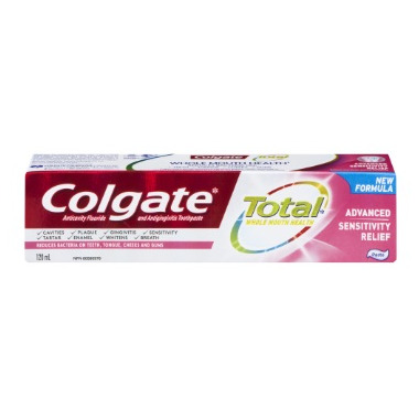 Colgate Total Advanced Sensitive Relief has an advanced formula that provides effective and long-lasting relief from sensitivity pain (with continous use of a Colgate Total variant) by building a protective layer over sensitive areas of the teeth. It not only actively fights bacteria on your teeth, but also on your tongue, cheeks and gums.