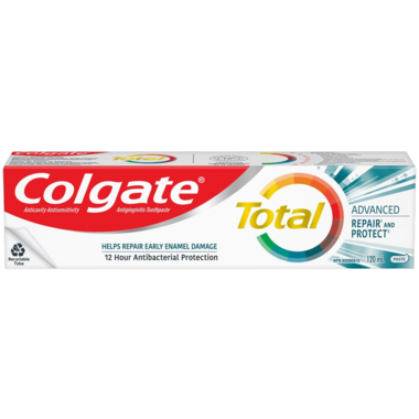 Remineralize your weakened tooth enamel to strengthen your teeth with Colgate Total Advanced Daily Repair Toothpaste. It not only actively fights bacteria on your teeth, but also on your tongue, cheeks and gums.
