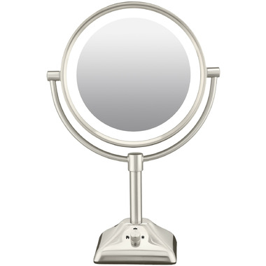 This true glow round double-sided lighted mirror features soft halo lighting for clear viewing. With an elegant 8.5" Round shape, This classic contemporary mirror is suitable for all rooms. Comes with 3 light settings simulating day, home, and office light for perfect make-up application. It rotates 360 degrees for standard 1X viewing or 10X magnification, and features a beautiful satin nickel finish. Get ready for your close-up!.