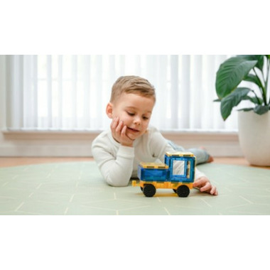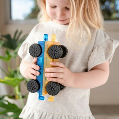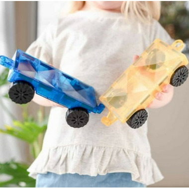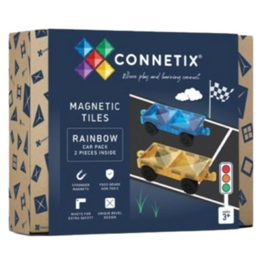 Add a new dimension to your magnetic tile play and get your imagination moving! The CONNETIX 2 Piece Rainbow Car Pack includes one blue and one yellow motion base featuring REAL rubber wheels and a unique bevel design. This pack adds to the endless possibilities of CONNETIX magnetic tiles, promoting endless possibilities for children to design and create their own motion structures from cars, trucks, trains, buses, fire trucks, tractors and space cars, to moving robots, fantastical creatures, and so much more!