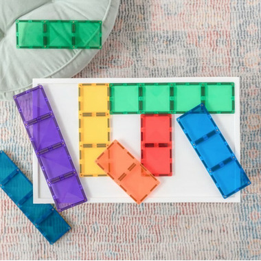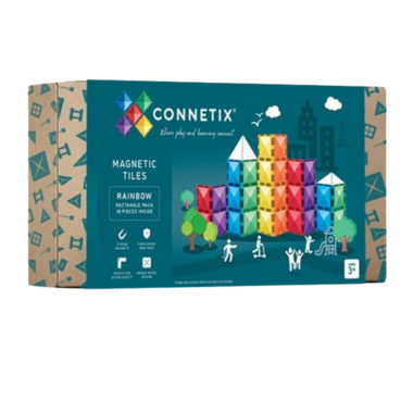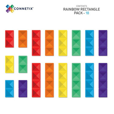 Available in six vibrant rainbow colours and featuring their unique bevel design, the 18 Piece Rainbow Rectangle Pack includes three rectangle sizes designed to spark imagination and creativity! Exclusively designed to be the same length as two, three or four standard CONNETIX squares connected together, this pack will give your builds the extra stability and structure you need to create bigger, more elaborate designs.