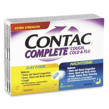 Contac Complete Cough, Cold & Flu is available in Non Drowsy Relief or Nighttime Relief that lets you get your rest. Also available are convenient day/night combo packs so you can feel better - day or night.