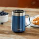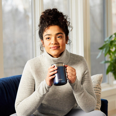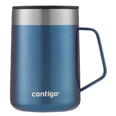 The Stainless Steel Vacuum-Insulated Mug, 14 oz., combines the convenience of having drinks that stay hot or cold for hours with a sophisticated design in eye-catching metallic colors. Drinks stay hot for 5 hours or cold for 15 hours, perfect for sipping coffee while working from home or on a short walk around the neighborhood. The comfortable handle makes drinking your favorite beverages more enjoyable and the splash-proof lid keeps your drink inside the mug when closed. Wherever you are, the non-slip grip base helps prevent the mug from slipping, clanking, or scratching on surfaces so you feel confident setting it down. The mug conveniently fits under most single-serve brewers for filling up while multitasking. At the end of a long day, you'll appreciate that the lid and body are top-rack dishwasher-safe for easy cleaning.
