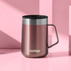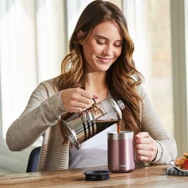 The Stainless Steel Vacuum-Insulated Mug, 14 oz., combines the convenience of having drinks that stay hot or cold for hours with a sophisticated design in eye-catching metallic colors. Drinks stay hot for 5 hours or cold for 15 hours, perfect for sipping coffee while working from home or on a short walk around the neighborhood. The comfortable handle makes drinking your favorite beverages more enjoyable and the splash-proof lid keeps your drink inside the mug when closed. Wherever you are, the non-slip grip base helps prevent the mug from slipping, clanking, or scratching on surfaces so you feel confident setting it down. The mug conveniently fits under most single-serve brewers for filling up while multitasking. At the end of a long day, you'll appreciate that the lid and body are top-rack dishwasher-safe for easy cleaning.
