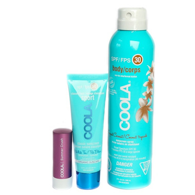 COOLA Tropical Coconut Classic Body Sunscreen Spray SPF 30 (236 mL): A spray that slays! The COOLA Eco-Lux size organic Sport SPF 30 Continuous Sunscreen Sprays have your back—and every other inch of your skin—with a bottle that keeps misting even when it's upside down, making it easy to cover your entire body. This sheer, water- and sweat-resistant organic formula is packed with antioxidants and skin-nourishing ingredients, and absorbs fast with no greasy feel. So you can play hard without any slippery residue.