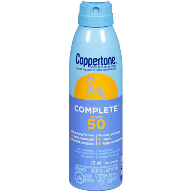 Coppertone Complete Sunscreen Spray provides everyday sun protection for the whole family. With a multi-benefit formula that helps your skin in more ways than one, this spray on sunscreen protects you from the sun with a durable and water resistant sunscreen formula (80 minutes). Coppertone Complete Sunscreen Spray offers Broad Spectrum UVA/UVB protection in a lightweight sunscreen formula that moisturizes all day.* Gentle on the skin, this body sunscreen spray rubs on easily, does not clog pores or run into your eyes. Plus, this sunscreen spray SPF 50 has a continuous sprayer for application at any angle. This Coppertone sunscreen spray is free from oxybenzone, octinoxate, PABA, phthalates and dyes. Each sunscreen Coppertone creates follows a tradition of trusted, quality sun protection products. Coppertone has been providing continuous innovation for more than 75 years, and is voted the most trusted sunscreen brand.** *for sun protection, use as directed **Voted Most Trusted Sunscreen Brand by Canadian shoppers based on the 2023 BrandSpark Canadian Trust Study